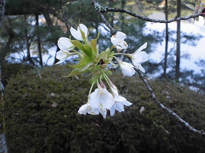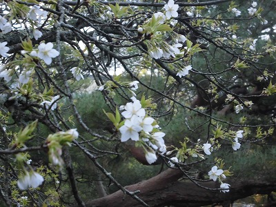 さて神苑の桜の一種、寒緋とまた赤実大島が枝から白い花を咲かせてまいりました。