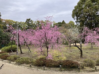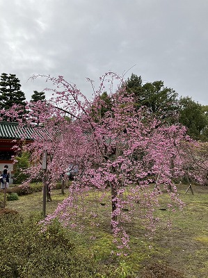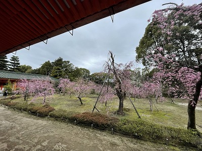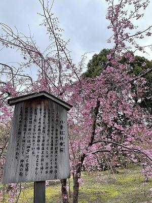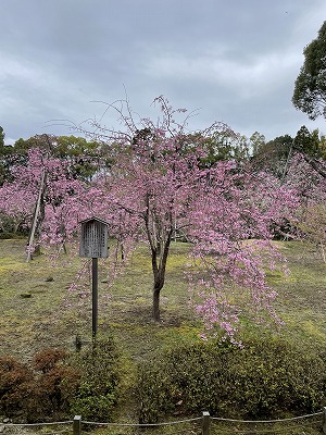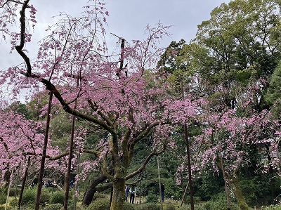 神苑入口入ってすぐ八重紅枝垂桜が咲いております。