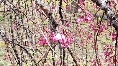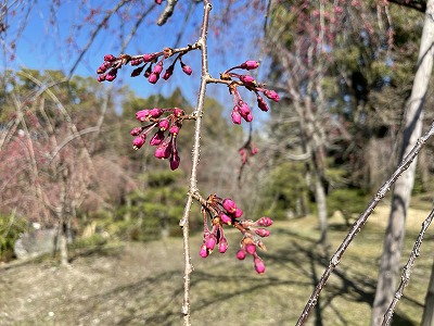 南神苑入口の紅しだれ桜が蕾ふくらむと紹介させていただきます。