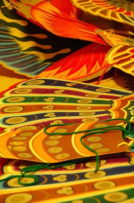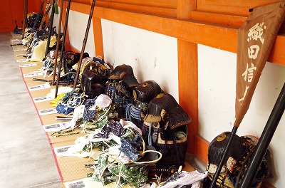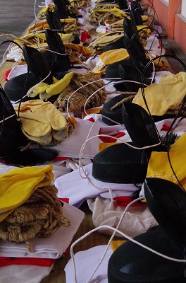 昨日、今日とこの行列で使用される装束や祭具が一斉に蔵から境内に運び出され、明日の出番を今か今かと待っています。