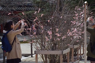結び木におみくじが増えていく様子は、あたかも桜の花が次々と開花していくようです。