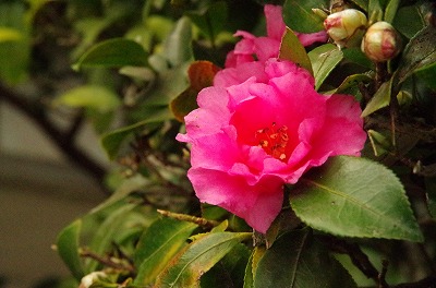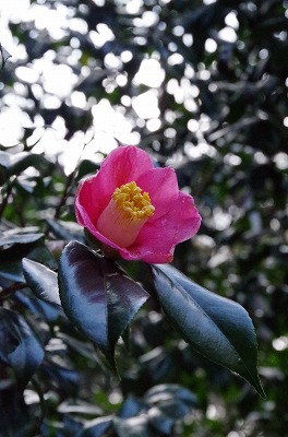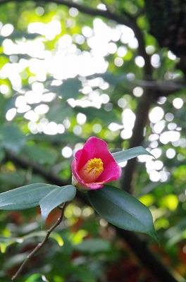 さて、神苑では山茶花があちこちで白や紅の花を咲かせています。