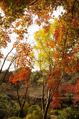 小高い丘の麓となっており、また階段を上ることはできませんが下からですとちょうど南神苑の入口付近を見上げる形となります。陽射しを通してキラキラと輝くような紅葉が美しいポイントです。