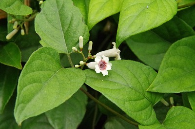 万両といえば冬場に真っ赤な実をつけているイメージが強いですが、花は爽やかな白です。