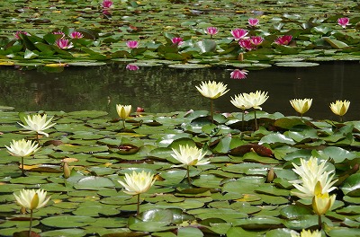 白の他、赤紫や黄色、ピンクなど色とりどりの花が池を飾ります。