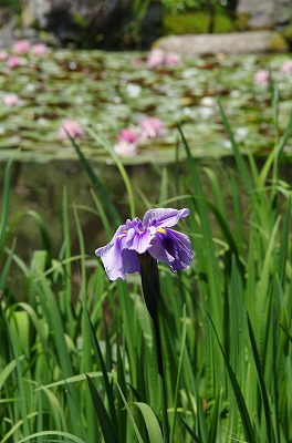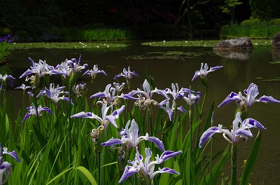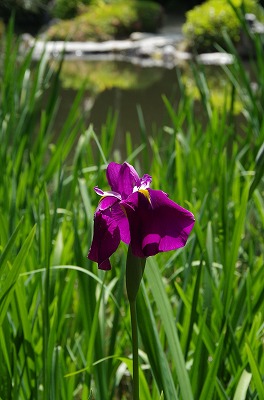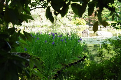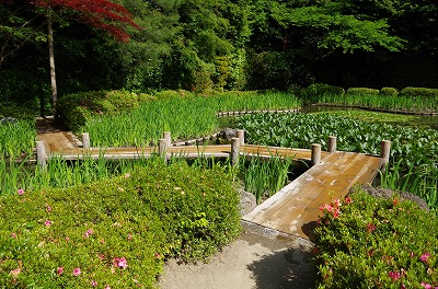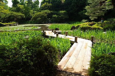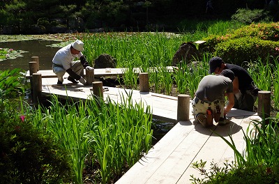 花菖蒲の咲く西神苑白虎池では、今年も開花に向けて八ツ橋が架かりました。