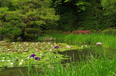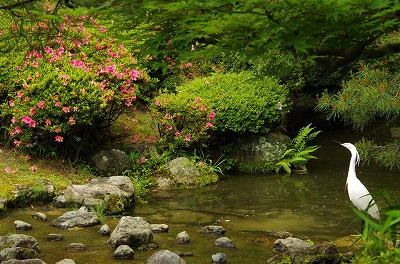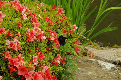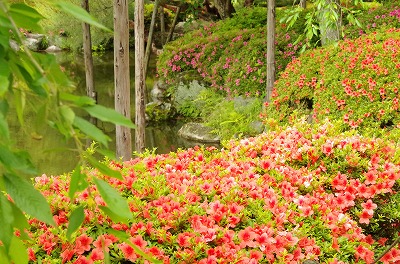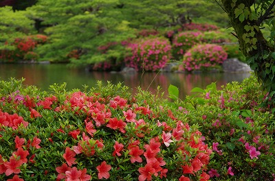 開放感でいっぱいの栖鳳池(せいほういけ)は周囲を取り囲むサツキの鮮やかな色に彩られています。