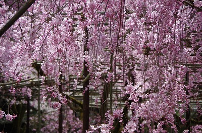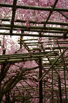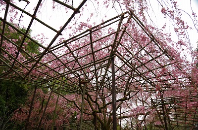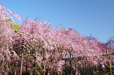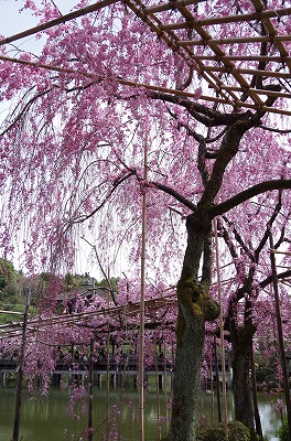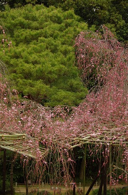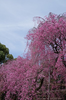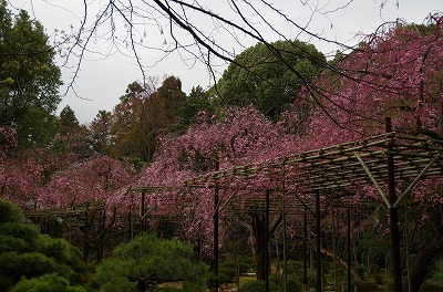 神苑に入られますと最初に目に飛び込んでくるのが八重紅枝垂桜の林です。