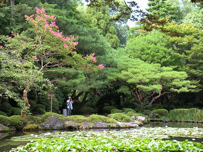 神苑では変わらず睡蓮、河骨が池を彩り、百日紅の花の数もぐっと増えました。