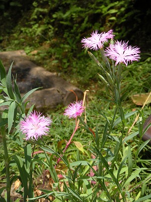 こちらは撫子。撫子と聞いて思い浮かぶのはやっぱり「大和撫子」という言葉ですが、大和撫子とは日本原産のこの撫子を中国産の石竹(唐撫子)と対して呼ぶ名前です。古今和歌集が発祥で、源氏物語にも登場します。一番有名なのは枕草子でしょう。清少納言もまず初めに「草の花はなでしこ~」と言っています。今は専ら日本女性の清らかさ、美しさをたたえる時に使われますね。「なでしこ」の語源には、神々の中でも特に美しいことで有名なクシナダヒメノミコトがご両親のテナヅチノミコト・アシナヅチノミコトに「撫でるように大切に育てられた(姫)」であるという説があります。このピンクの可憐な花は、「子を撫でる、慈しむ」心に満ちた美しい日本の女性のイメージにもピッタリですね。