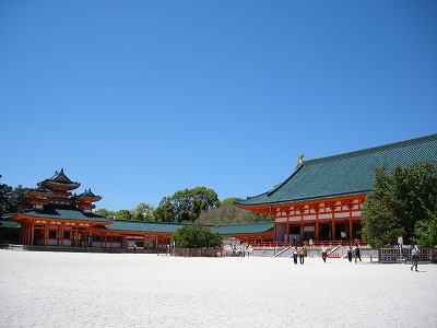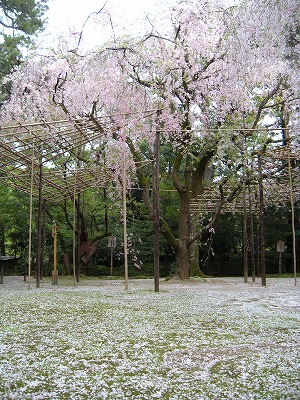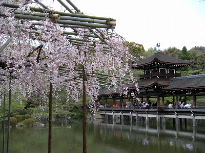 平安神宮神苑には南・西・中・東の4つのエリアがあり、皆様がまずお入りになられる所が南神苑です。ここには八重紅枝垂桜や普賢象などの里桜が数多く植えられていますが、別名を「平安の苑」といいます。