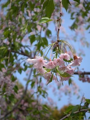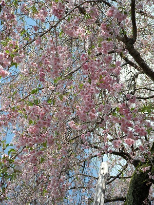 八重紅枝垂桜も散り始め、葉が出はじめた枝もありますが、ご覧の通りまだ花は充分についています。