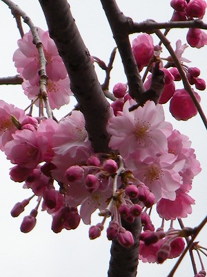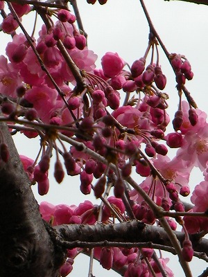 八重紅枝垂桜をご覧になるには、色の濃い咲き始めがおすすめです。