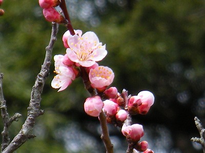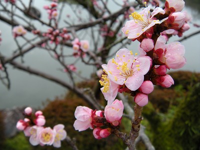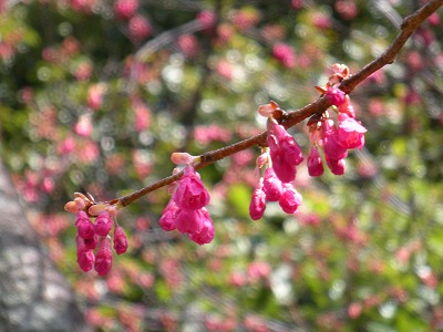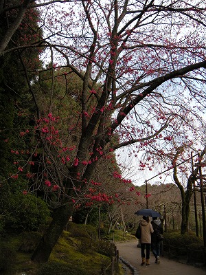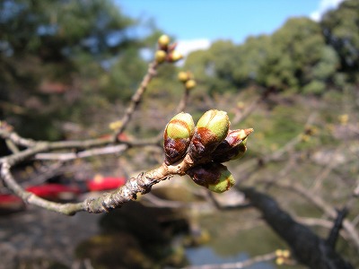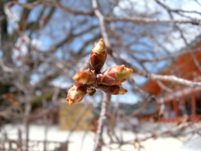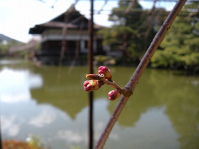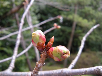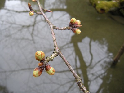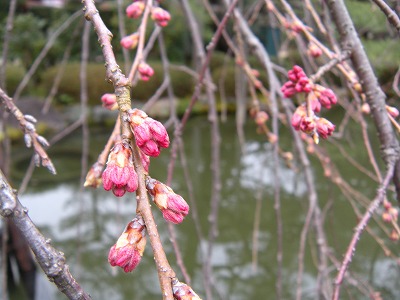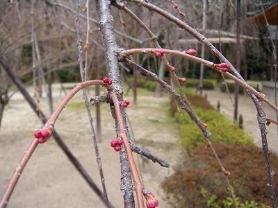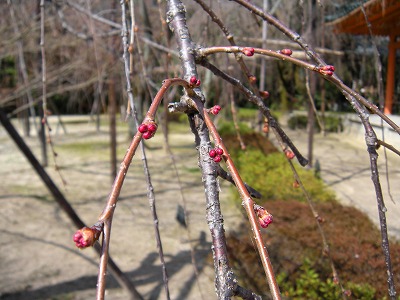 神苑の桜の状態は昨日とほとんど変わりありません。赤実大島桜と寒緋桜が咲き初め。その他の桜は蕾です。