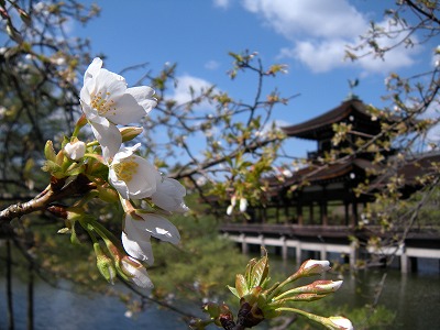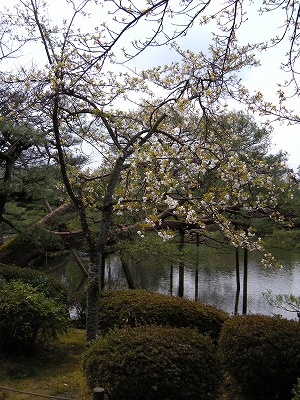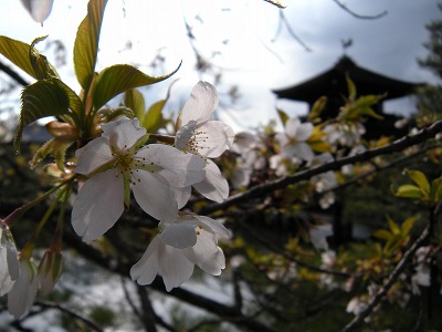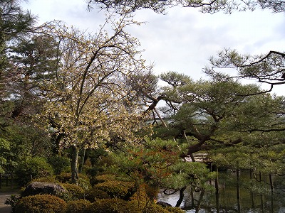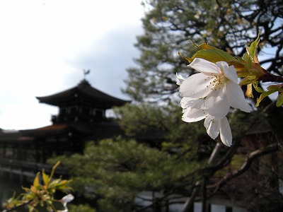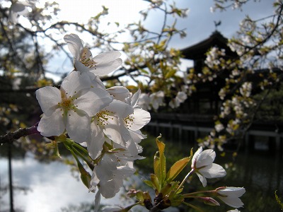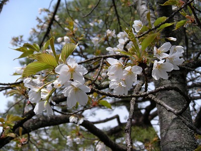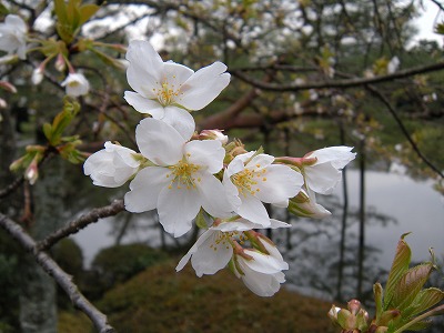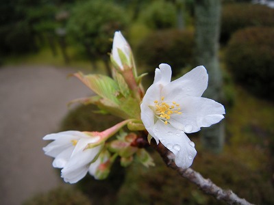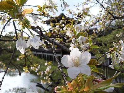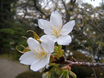 この赤実大島桜の木も東神苑にあります。広い「栖鳳池」に沿って歩いていただくと、最後に「泰平閣(橋殿)」という屋根付きの橋が出てまいります。赤実大島はこの橋の入口に向かって左に2本、やや大きめの白い花を咲かせてくれています。順路から少し外れたところに植えられていますので、多くの方は見落とされていらっしゃるようですが、写真を撮るにもなかなかいいポイントだと思いますので、皆様この赤実大島の木をお見逃しなく。