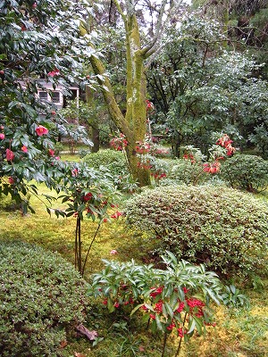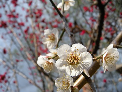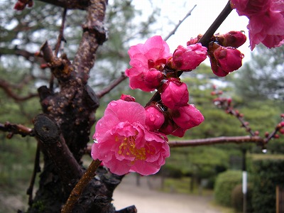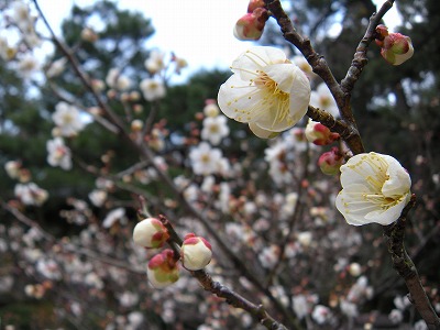 桜は蕾ですが、神苑内では梅や桃、椿に山茶花などが花をつけています。