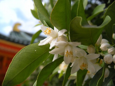 そして本日は神苑内ではありませんが、大極殿向かって左にある『右近の橘』の白く小さな花が咲き、甘い香りを辺りに漂わせています。