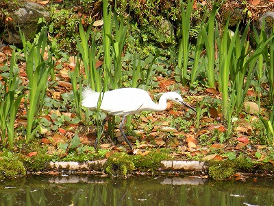 アヤメ畑の中で餌を探す若い鷺(中神苑)。