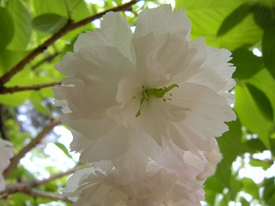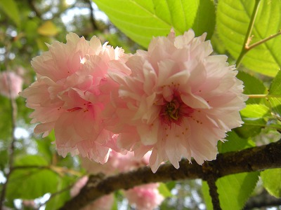 黄色い花弁の鬱金桜は花の中心あたりの色がピンクに変わり始めました。