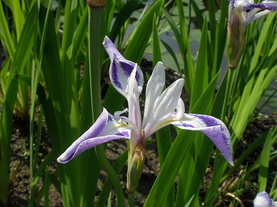 中神苑の東屋前には一層気品に溢れ、その姿から『折鶴』と命名された杜若があります。