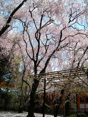 花が散ってしまわないかと心配ですが、紅枝垂桜はただいま満開。