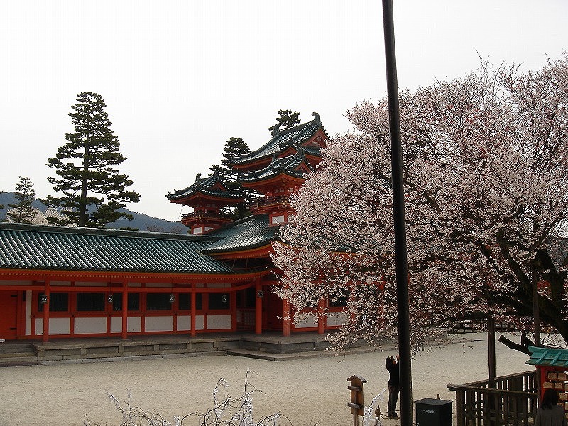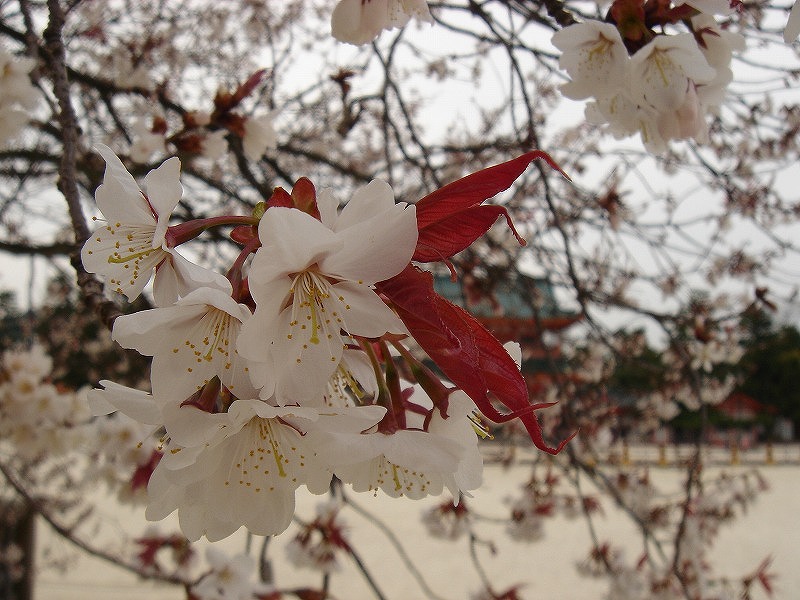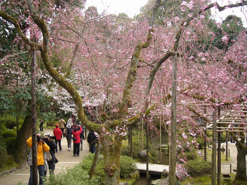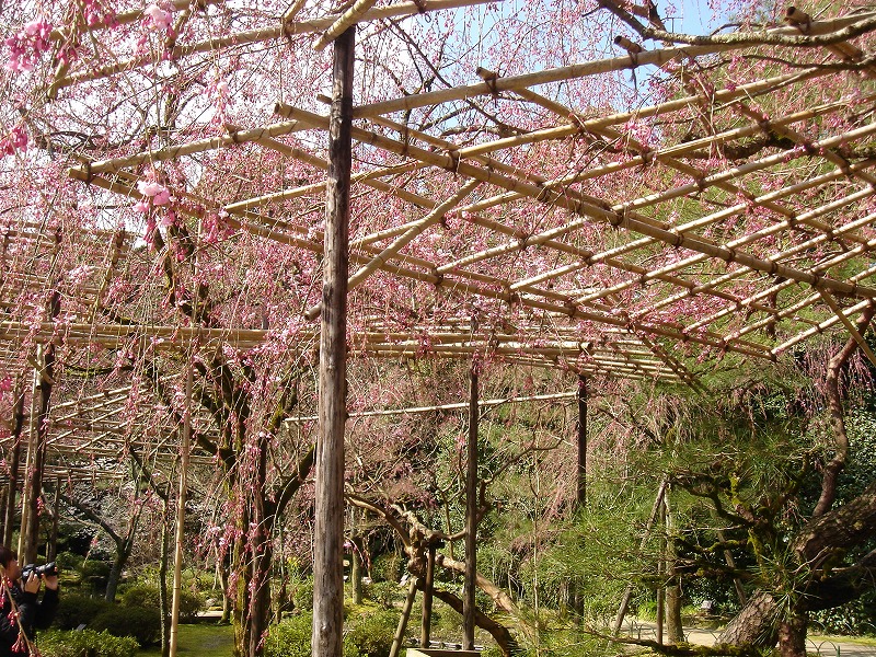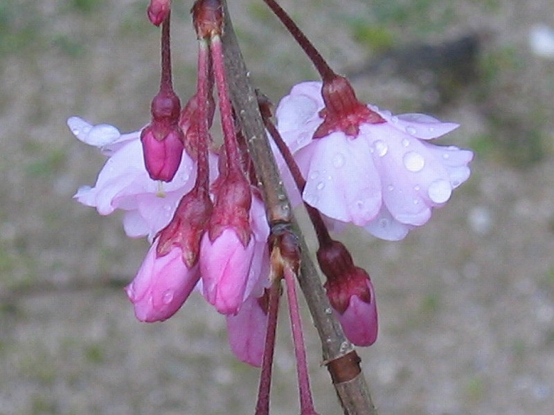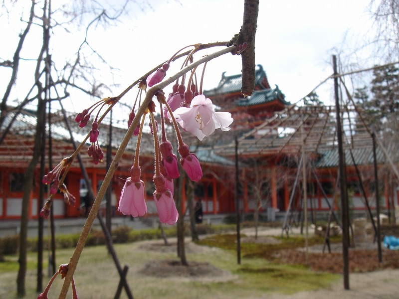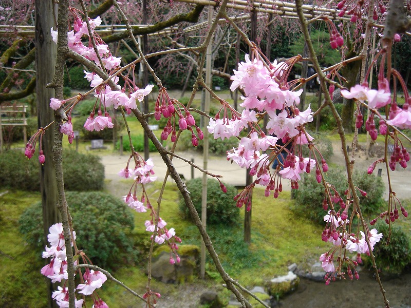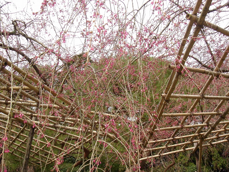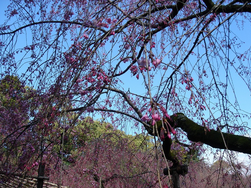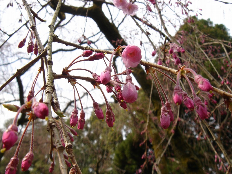 神苑内全体の八重紅シダレザクラの開花情報としては、「咲き初む」ですが、